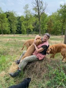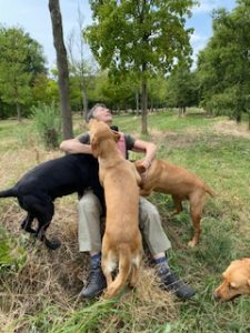 Wanneer mijn grote honden komen knuffelen hangt hij daar ook altijd ergens tussen.
